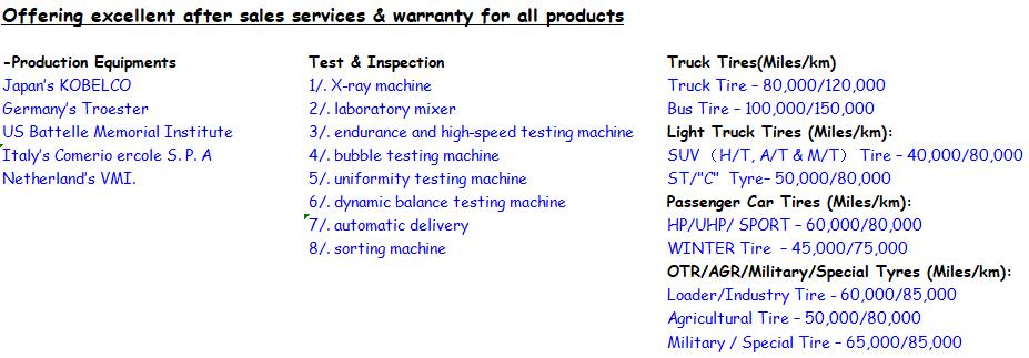 Developing all series of Tyres for Passenger cars cover eight series, 210 sizes and 350 products: HP tyres,UHP tyres, Sport Racing tyres,SUV-HT/AT/MT tyres, Winter/Snow/Ice tyres and Light truck tyres.